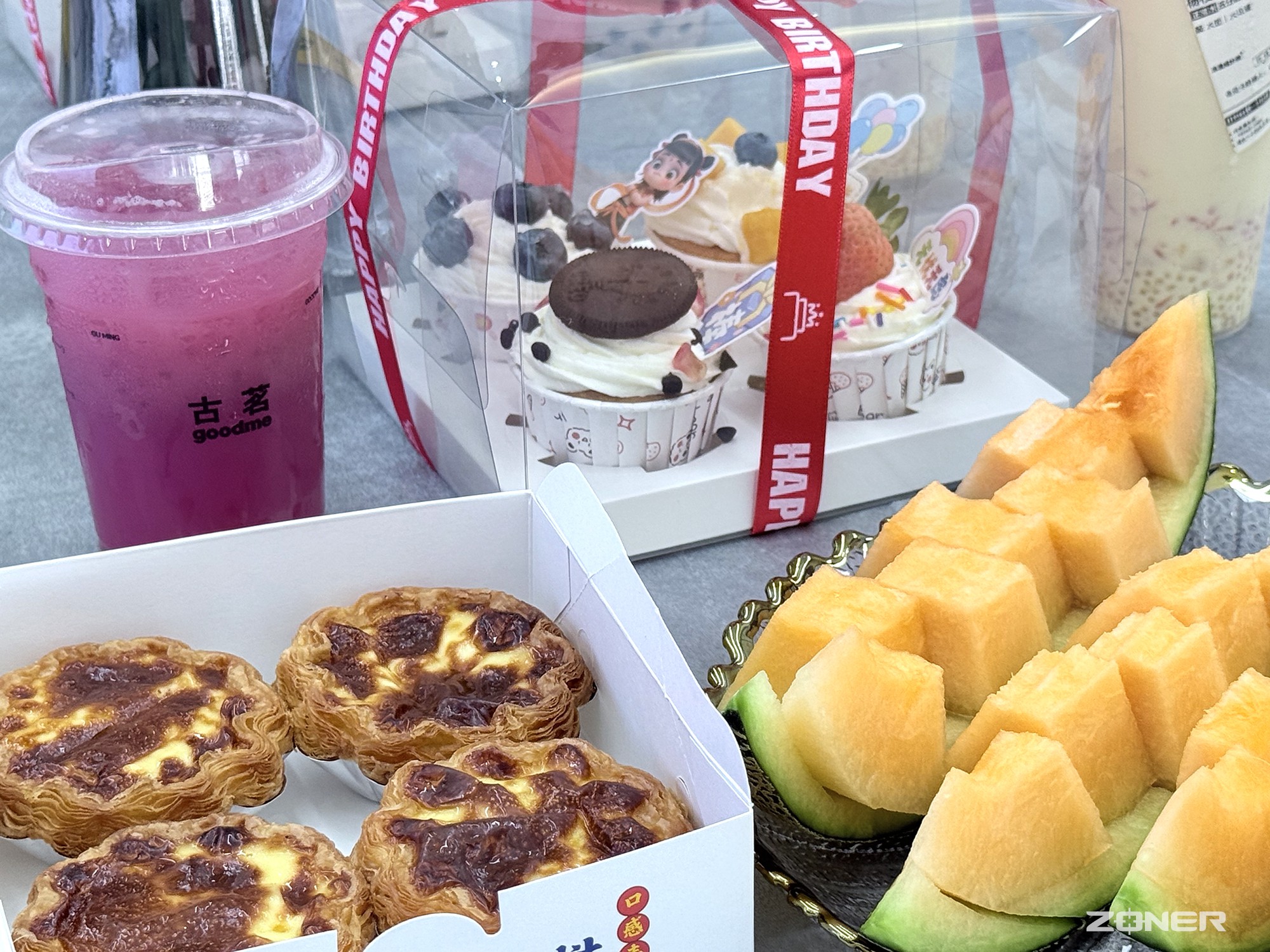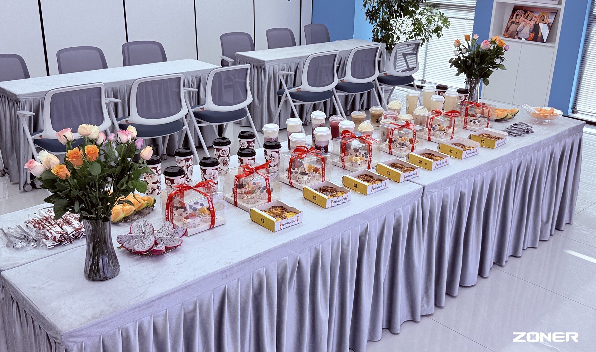 走进会议室,最先被吸引的便是长桌上的 “甜蜜阵列”:后排整齐码放着不同口味的奶茶,经典的珍珠奶茶、清爽的杨枝甘露、醇厚的芝士莓莓一字排开,杯身贴着手写的 “纵能伴你过七夕” 小标签;前排区域是甜点的主场,方形慕斯蛋糕裹着细腻的奶油,表面用巧克力酱画着简约的鹊桥图案,金黄酥脆的蛋挞冒着淡淡的奶香,咬开就能尝到流心的蛋黄馅;左右两侧的水果拼盘更是色彩亮眼,切好的蜜瓜拼盘,火龙果、蓝莓、西瓜错落摆放,新鲜的果香与奶茶的甜香交织在一起,让人忍不住放慢脚步。