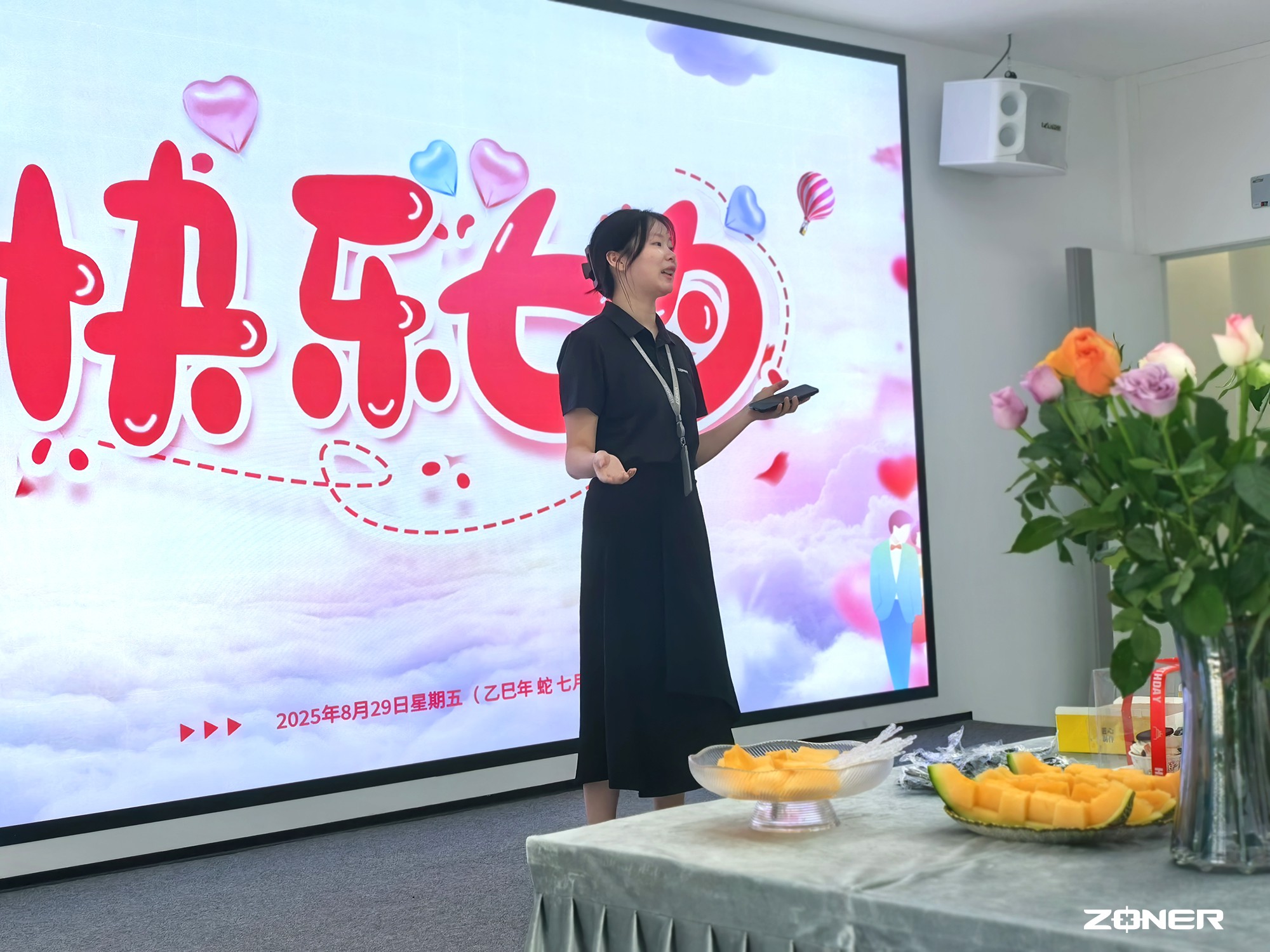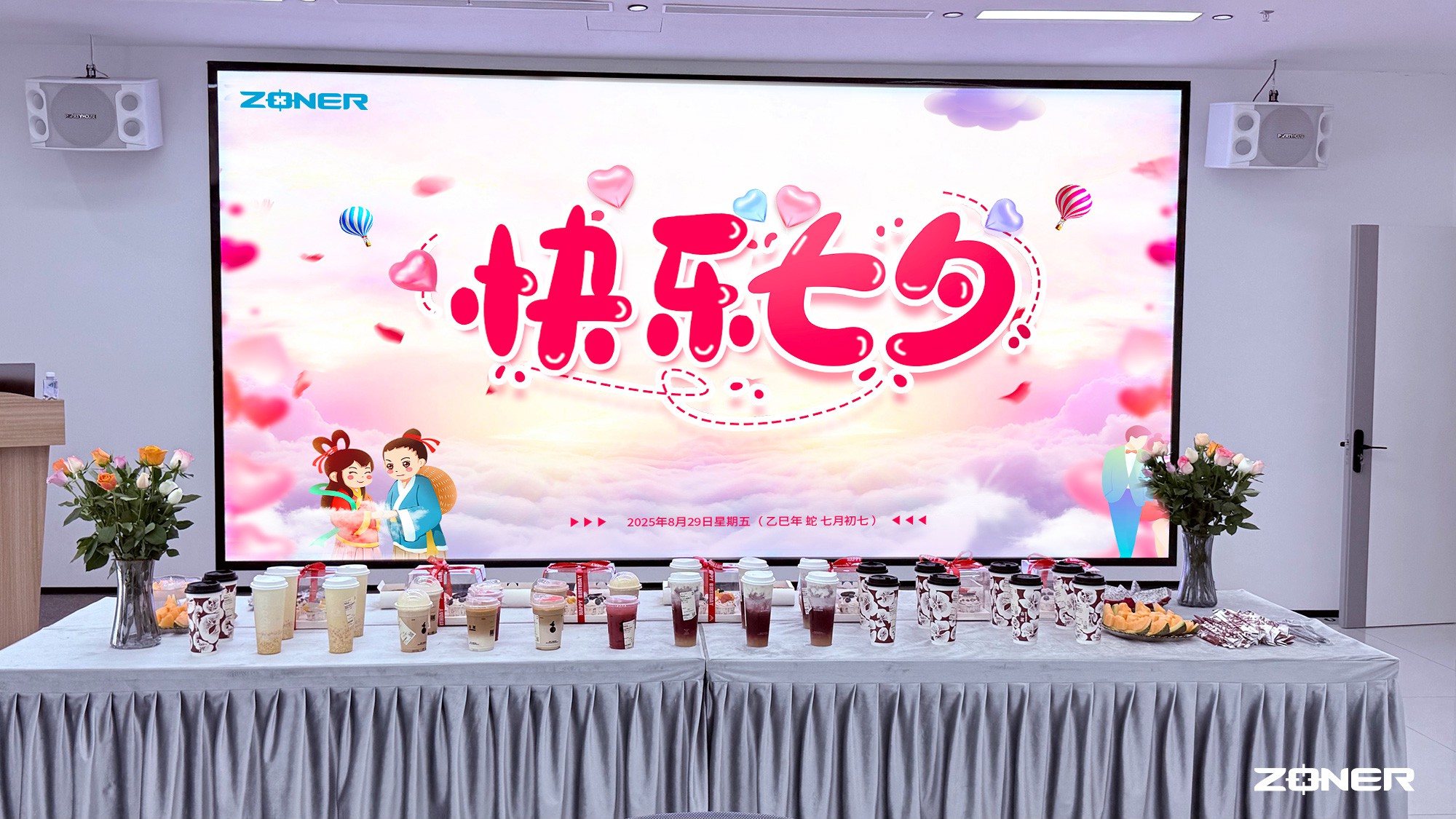 “原来会议室还能这么布置!” 刚走进来的财务部同事忍不住感叹,手里的手机已经开始记录眼前的场景 —— 大屏幕的 “七夕快乐” 作背景,长桌上的茶点排列得满满当当,每个角落都透着用心。不少同事拿出手机拍照,想把这份纵能专属的七夕甜蜜分享到朋友圈。