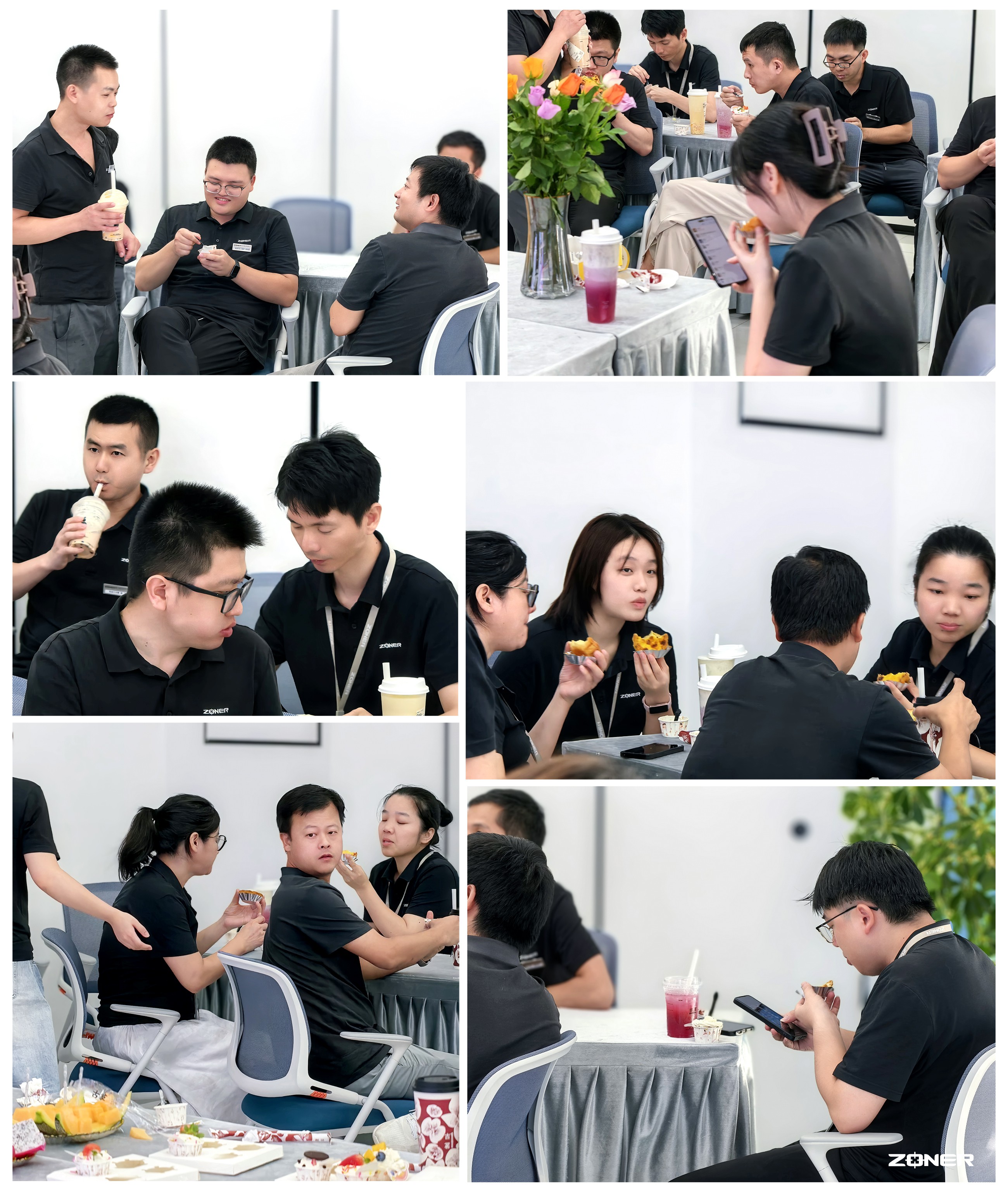 简短的开场发言结束后,大家纷纷起身走向长桌,自由挑选喜欢的茶点。生产部的小伙伴们围在一起,讨论着 “珍珠奶茶和芝士莓莓哪个更甜”;研发部的同事们拿着蛋挞,坐在会议室的椅子上轻声交流,偶尔传来几句关于工作的讨论,却因为手里的甜点多了几分轻松;行政部的同事们则忙着帮大家递纸巾、分餐具,笑着说 “慢慢选,每个人都能拿到喜欢的”。整个会议室里没有喧嚣的热闹,只有彼此分享的温馨,每一份茶点都成了连接心意的小纽带。