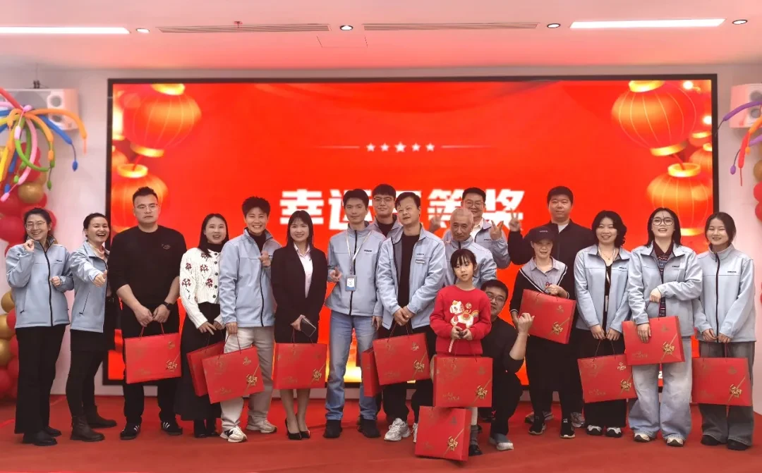 最令人期待的抽奖环节无疑是整场晚宴的 “燃点”!丰厚的大奖早已备好,随着主持人一次次念出幸运号码,现场气氛被推向一个又一个高潮。每一轮抽奖都牵动着全场的心,欢呼声、尖叫声此起彼伏,中奖的家人喜笑颜开,未中奖的伙伴也为身边的幸运儿送上真挚祝福。从惊喜满满的二等奖到万众瞩目的一等奖,每一份奖品都承载着公司对员工的满满关怀,让整场晚宴沉浸在 “好运连连、喜乐共享” 的热烈氛围中。